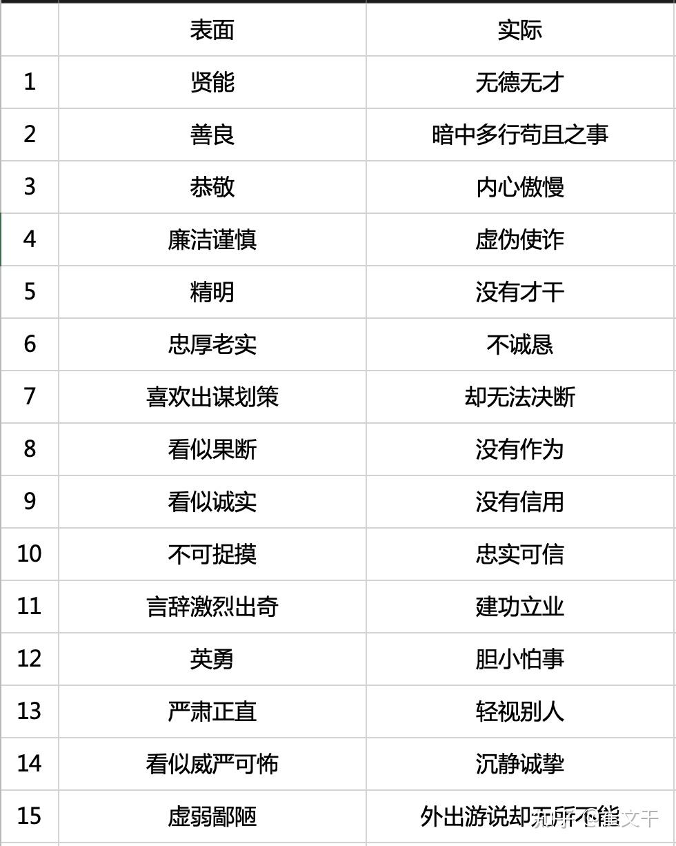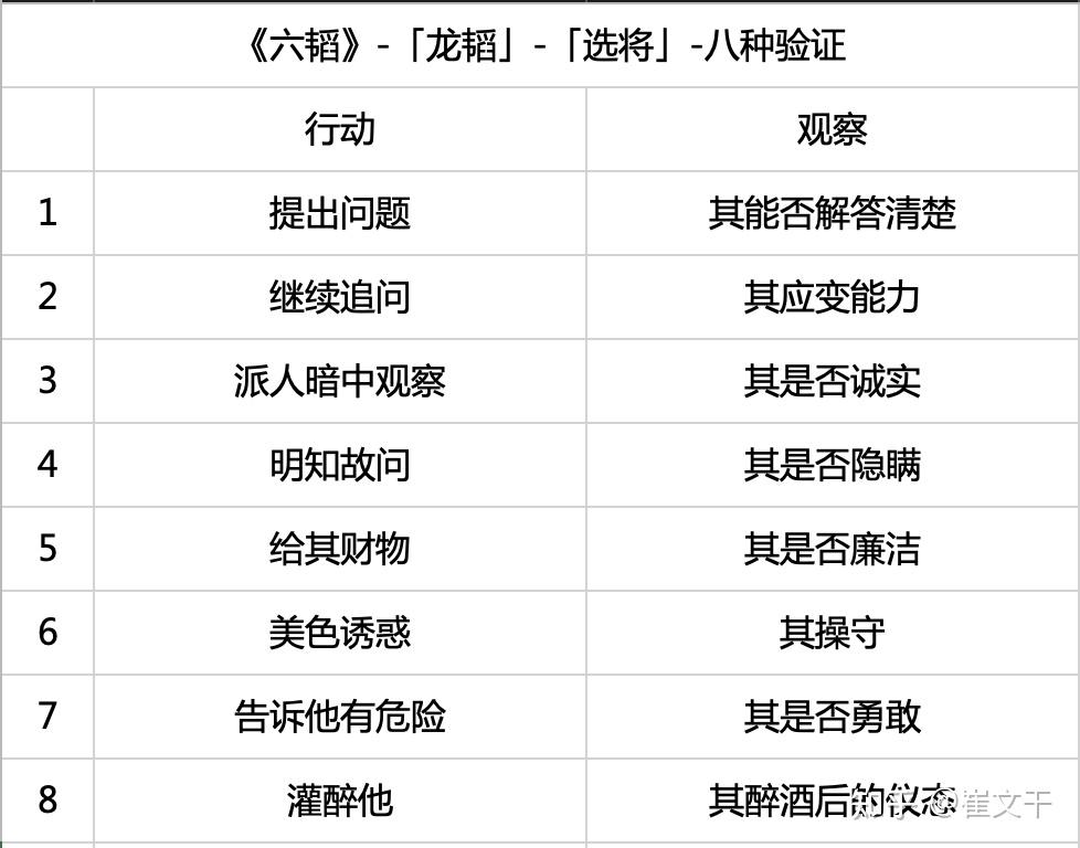 在「论将」之后,知道标准之后,就是具体的要如何考察有才之士了。于是紧接着就是「选将」。在这一则,姜太公讲述了一些表里不一、内外不符的十五种情况,以及如何查看一个人的真实情况的八种验证。