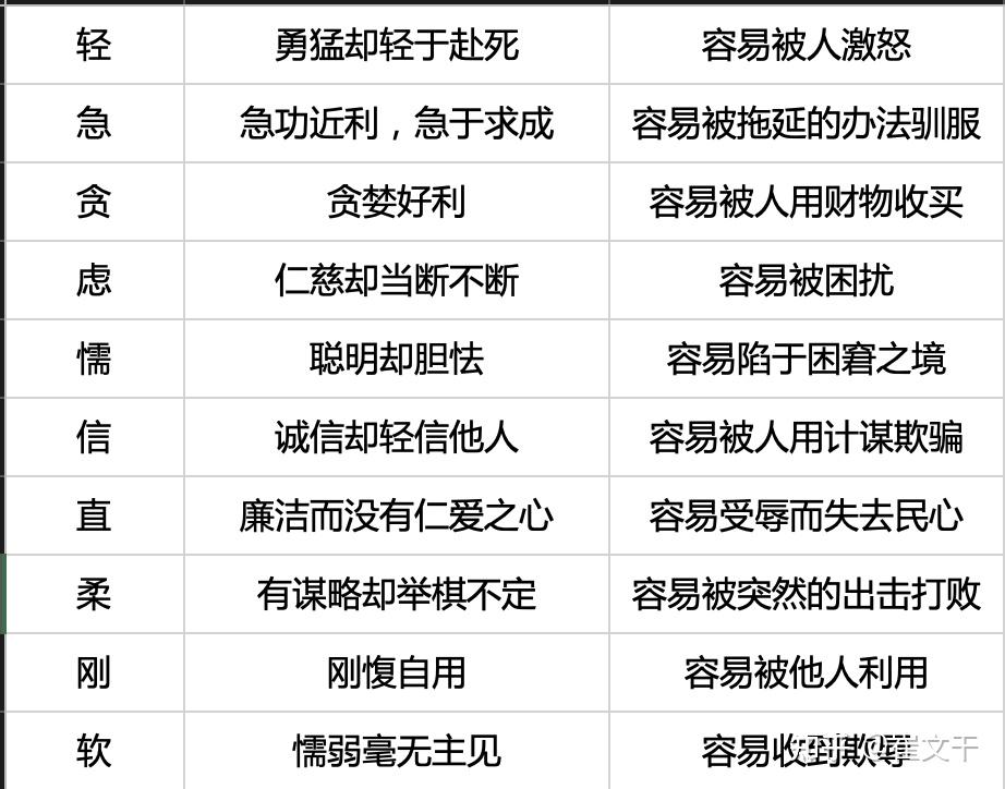 文字有些多,但是确实字字精华啊。已经不需要我多余的解释了。看了就明白了。我概括了一下,大概每一种过失用一个字概括的话就是:轻、急、贪、虑、懦、信、直、柔、刚、软。个人理解出来,并不一定概括正确。只是为了便于以后记忆。在此,我将它改成了一个表格,便于查看: